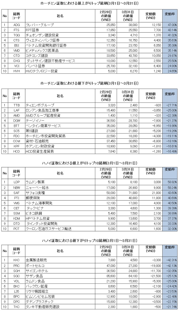 終値 前営業日比 騰落率(%) VN指数 1055.45 -46.21 -4.19 VN30指数 1064.95 -48.37 -4.34 ...