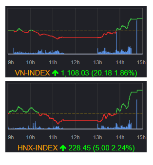 終値 前営業日比 騰落率(%) VN指数 1108.03 +20.18 +1.86 VN30指数 1123.69 +18.80 +1.70 ...