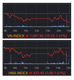 終値 前営業日比 騰落率(%) VN指数 1087.85 -15.55 -1.41 VN30指数 1104.89 -20.67 -1.84 ...