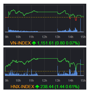 終値 前営業日比 騰落率(%) VN指数 1151.61 +0.80 +0.07 VN30指数 1165.49 -1.80 -0.15 ...