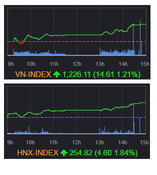 終値 前営業日比 騰落率(%) VN指数 1226.11 +14.61 +1.21 VN30指数 1234.57 +9.07 +0.74 ...