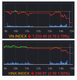 終値 前営業日比 騰落率(%) VN指数 1233.48 -9.78 -0.79 VN30指数 1247.82 -9.13 -0.73 ...