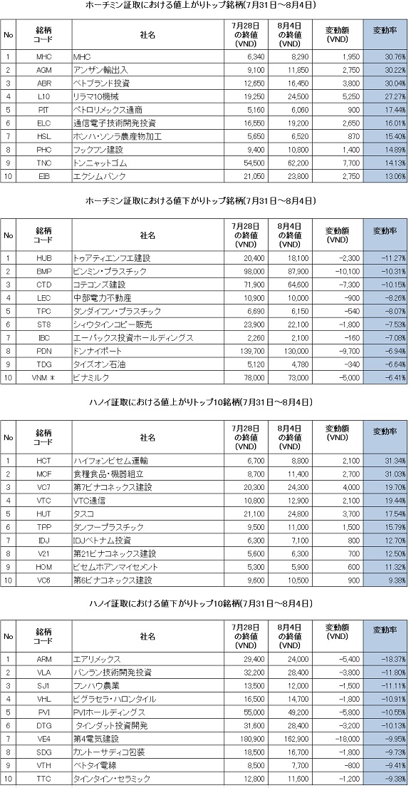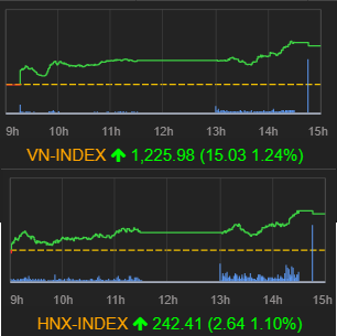 終値 前営業日比 騰落率(%) VN指数 1225.98 +15.03 +1.24 VN30指数 1231.42 +20.62 +1.70 ...