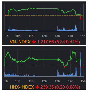 終値 前営業日比 騰落率(%) VN指数 1217.56 -5.34 -0.44 VN30指数 1222.18 -8.63 -0.70 ...