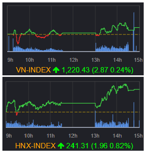 終値 前営業日比 騰落率(%) VN指数 1220.43 +2.87 +0.24 VN30指数 1221.32 -0.86 -0.07 ...