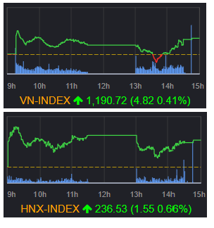 終値 前営業日比 騰落率(%) VN指数 1190.72 +4.82 +0.41 VN30指数 1193.14 +6.54 +0.55 ...