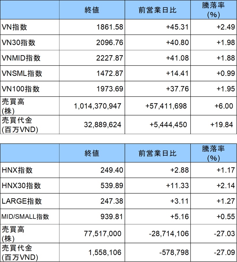 売買代金は32兆8896億VND(約1960億円)、前日比+19.8%増加した。主力株は軒並み上昇し、インデックスをけん引した。