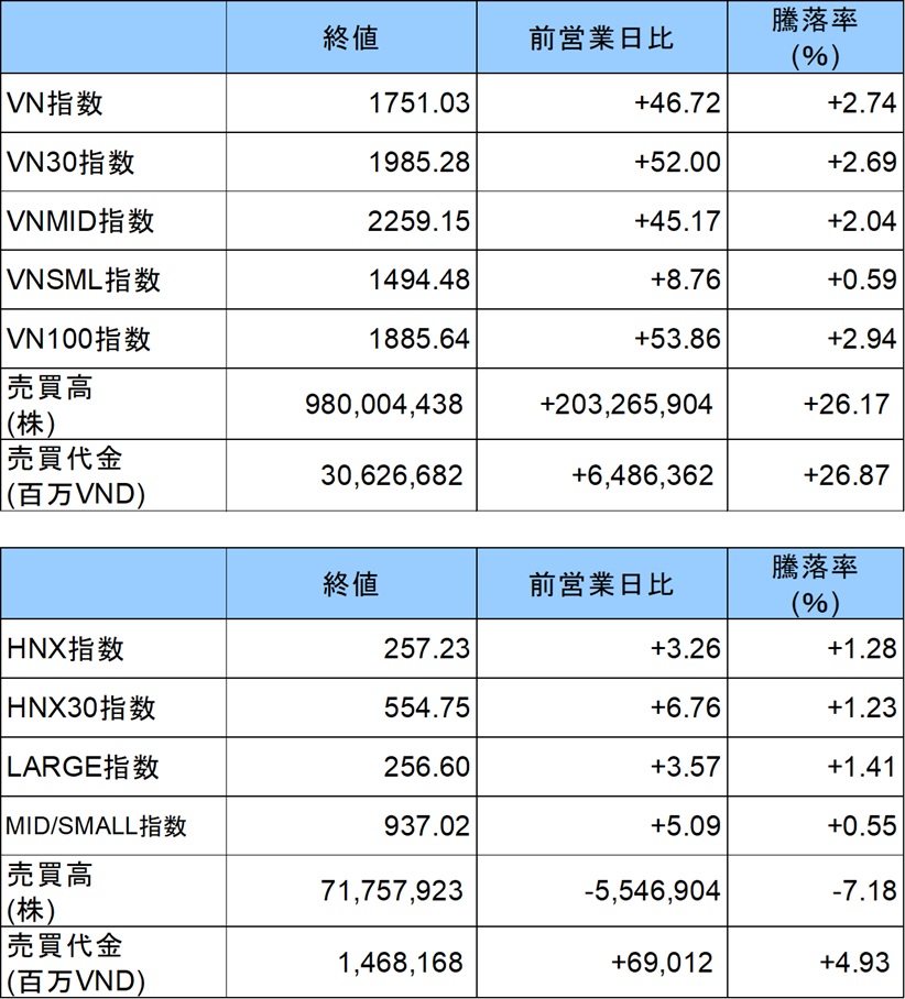 売買代金は30兆6267億VND(約1830億円)、前日比+26.9%増加した。主力株はほぼ全面高で、インデックスをけん引した。