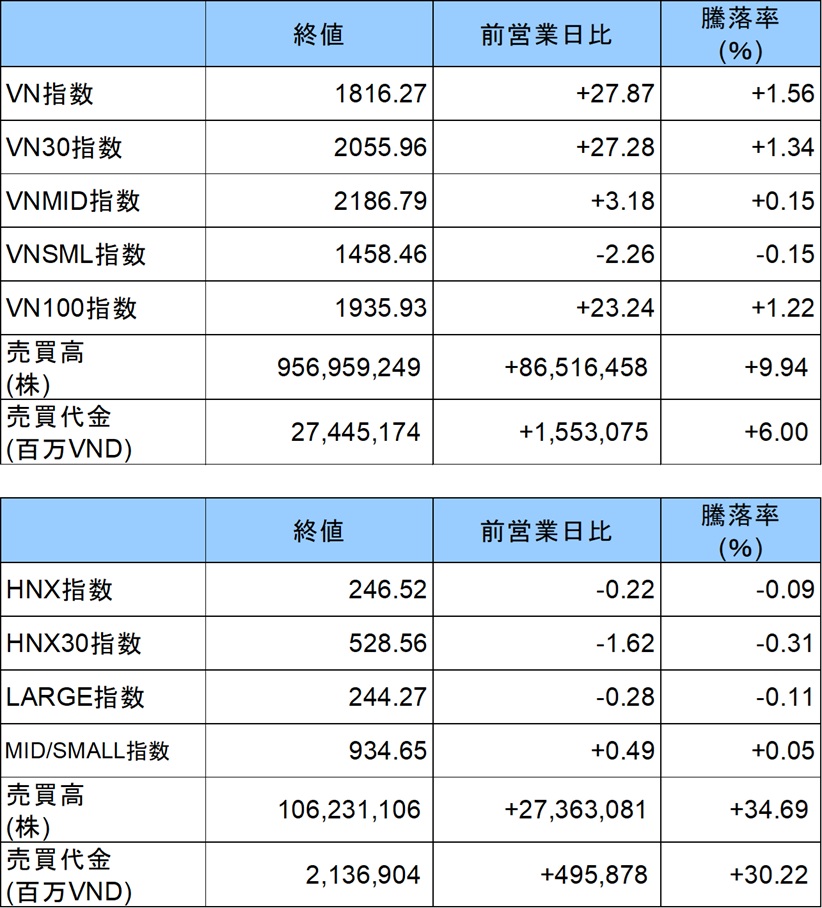 売買代金は27兆4452億VND(約1530億円)、前日比+6.0%増加した。主力株は値上がり銘柄が多く、インデックスをけん引した。