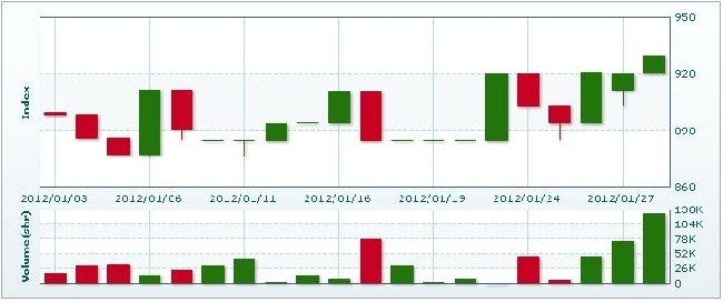 1月27日のラオス総合指数は前日比変わらずの920.32で取引を終えた。売買高は前日比59.39%増の7万4912株、売買代金は同44.31%増の3億2181万7200キープだった。