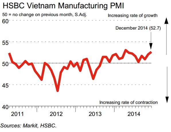 香港上海銀行(HSBC)発表のデータによると、2014年12月のベトナム製造業購買担当者指数(PMI)は、前月の52.1から+0.6P上昇の52.7となり、4月以降で最高値、直近3か月連続で上昇を記録した。ベトナムのPMIは2013年9月以降、業況判断の分岐点である50以上を維持している。...