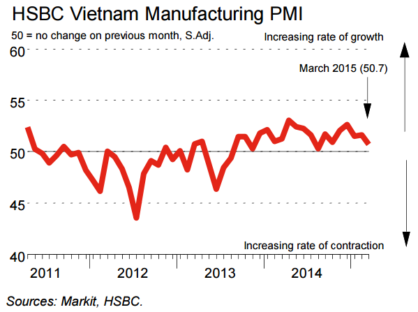 香港上海銀行(HSBC)の発表によると、ベトナムの2015年3月の製造業購買担当者指数(PMI)は50.7となり、前月の51.7から▲1.0ポイント低下したものの、2013年9月以降1年7か月にわたり、業況判断の分岐点である50以上を維持した。...