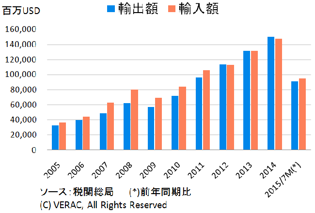 税関総局が発表した統計データによると、2015年7月の輸出額は前月比+1.0%減の141億8100万USD(約1兆7584億円)、輸入額は同+1.4%増の146億6800万USD(約1兆8188億円)だった。これにより、7月の貿易収支は▲4億8700万USD(約▲604億円)の赤字となった。 年初7か月の輸出額は前年同期比+9.3%増の917億6600万USD(約11兆3790億円)、輸入額は同+15.7%増の952億8900万USD(約11兆8160億円)。これにより、年初7か月の貿易収支は▲35億2300万USD(約▲4370億円)の赤字となる。年初6か月時点の貿易赤字額は▲30億7400万USD(約▲3810億円)で、年初5か月からの赤字拡大幅は2100USDに留まっていたが、年初7か月の赤字額は上半期から4.5億USD拡大。赤字拡大のスピードが加速している。 2015年7月 2015年年初7か月 金額(百万USD) 前月比 金額(百万USD) 前年同期比 輸出総額 14,181 ▲1.0% 91,766 9.3% 国内セクター 4,613 ▲2.0% 29,693 ▲8.2% 外資セクター 9,568 ▲0.5% 62,073 20.2% 輸入総額 14,668 1.4% 95,289 15.7% 国内セクター 6,074 ▲1.8% 38,566 6.5% 外資セクター 8,594 3.8% 56,723 22.9% 貿易収支 ▲487 輸出総額の ▲3.43% - ▲3,523 輸出総額の ▲3.84% - 年初7か月の輸出額のうち、品目別で金額が最も大きかったのは、「携帯電話・部品」の171億5218万USD(約2兆1270億円)で、前年同期比で+28.6%増加した。続いて、◇衣料・織物、◇コンピューター・電子製品・部品、◇履物、◇機械・設備・部品、◇製材・木工品、◇水産物、◇その他車両、◇原油、◇カメラ・ビデオカメラ・部品などとなっている。 一方、輸入額が最も大きかった品目は、「機械・設備・部品」の163億9757万USD(約2兆0330億円)で、前年同期比+33.8%増加。続いて、◇コンピューター・電子製品・部品、 ◇携帯電話・部品、◇織物、◇鉄鋼、◇石油・ガソリン、◇原料樹脂、◇縫製品・皮革製品用原料・副原料、◇鉄鋼製品、◇その他金属の順だった。年初7か月の貿易収支、赤字額が▲35億USDに拡大 税関総局が発表した統計データによると、2015年7月の輸出額は前月比+1.0%減の141億8100万USD(約1兆7584億円)、輸入額は同+1.4%増の146億6800万USD(約1兆8188億円)だった。これにより、7月の貿易収支は▲4億8700万USD(約▲604億円)の赤字となった。...