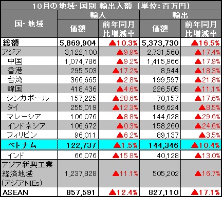 日本の財務省が発表した2016年10月の貿易統計(速報)によると、ベトナムの対日貿易収支は216億0900万円の黒字となったが、前年同月比で▲40.7%減少した。