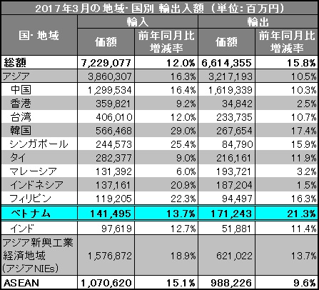 日本の財務省が発表した2017年3月の貿易統計(速報)によると、ベトナムの対日貿易収支は前年同月比で+77.8%増となる297億4800万円の黒字だった。