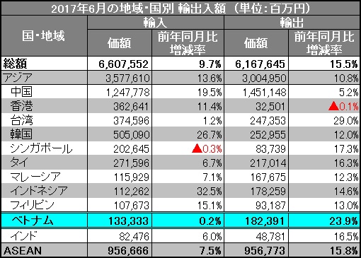 日本の財務省が発表した2017年6月の貿易統計(速報)によると、ベトナムの対日貿易収支は前年同月比で3.5倍となる490億5800万円の黒字だった。