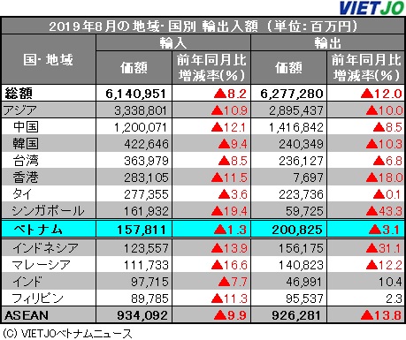 日本の財務省が発表した2019年8月の貿易統計(速報)によると、ベトナムの対日貿易収支は前年同月比▲9.1%減となる430億1400万円の黒字だった。