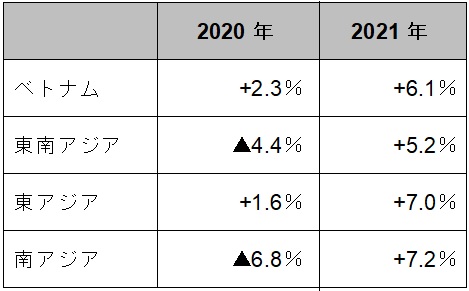 新型コロナ収束に伴い2021年のベトナムのGDP成長率は+6.1%に改善すると予想される。なお、ベトナムとアジア各地の2020年および2021年のGDP成長率予想は以下の通り。