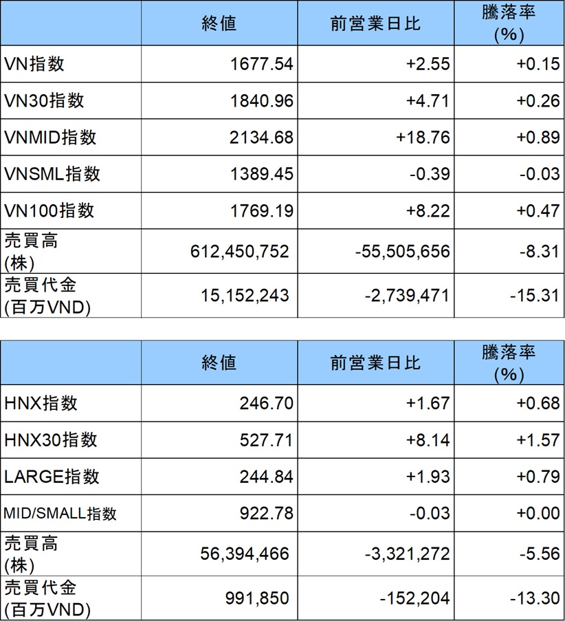 VNインデックスは前営業日比+2.55ポイント(+0.15%)上昇し、1677.54ポイントで引けた。前日まで3営業日連続で下落していたが、終盤に買い戻しが入りプラス圏を回復した。売買代金は前営業日から大幅に減少し、15兆1522億VND(約910億円)と閑散な取引となった。HNXインデックスは前営業日比+1.67ポイント(+0.68%)上昇の246.7ポイントで取引を終えた。売買代金は9919億VND(約60億円)だった。