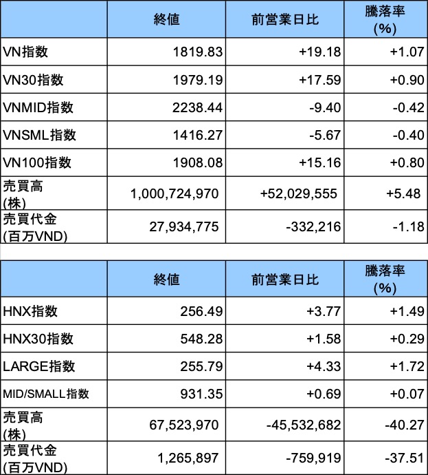 VNインデックスは前日比+19.18ポイント(+1.07%)上昇の1819.83ポイントで取引を終えた。HSXの売買代金は27兆9347億VND(約1680億円)と高水準を維持した。一方、ハノイ証券取引所(HNX)のHNXインデックスも前日比+3.77ポイント(+1.49%)上昇し、256.49ポイントとなった。HNXの売買代金は1兆2658億VND(約76億円)だった。市場全体では値下がり銘柄数が値上がり銘柄数を大きく上回っており、指数は上昇したものの実態は一部の大型株に依存した状態となっている。