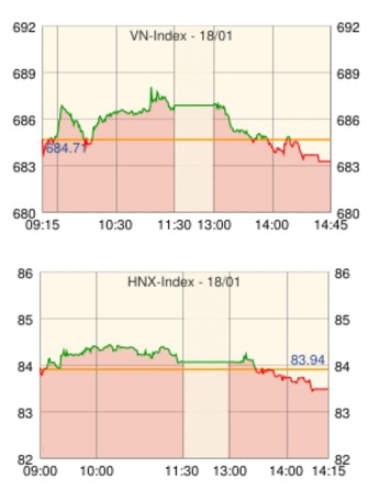 ホーチミン市場はマイナス圏で寄り付いた後一気に値を上げ、一進一退で688 (+0.48%)手前まで上昇する局面もあったが、後場に入ると上値の重さが意識され下落基調になりマイナス圏に転落、引け際に売りが強まったことでVNインデックスは▲1.43ポイント(▲0.21%)安の683.28の安値で引けた。売買代金は1兆6200億VND(約76億円)、前日比▲8.0%減少した。