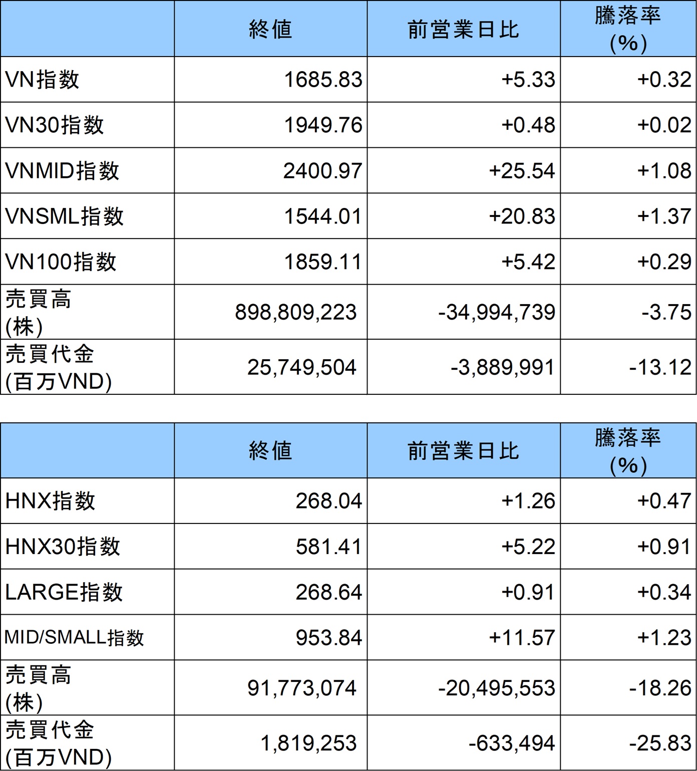 売買代金は25兆7495億VND(約1480億円)、前日比▲13.1%減少した。主力株は値上がり銘柄が多かった。