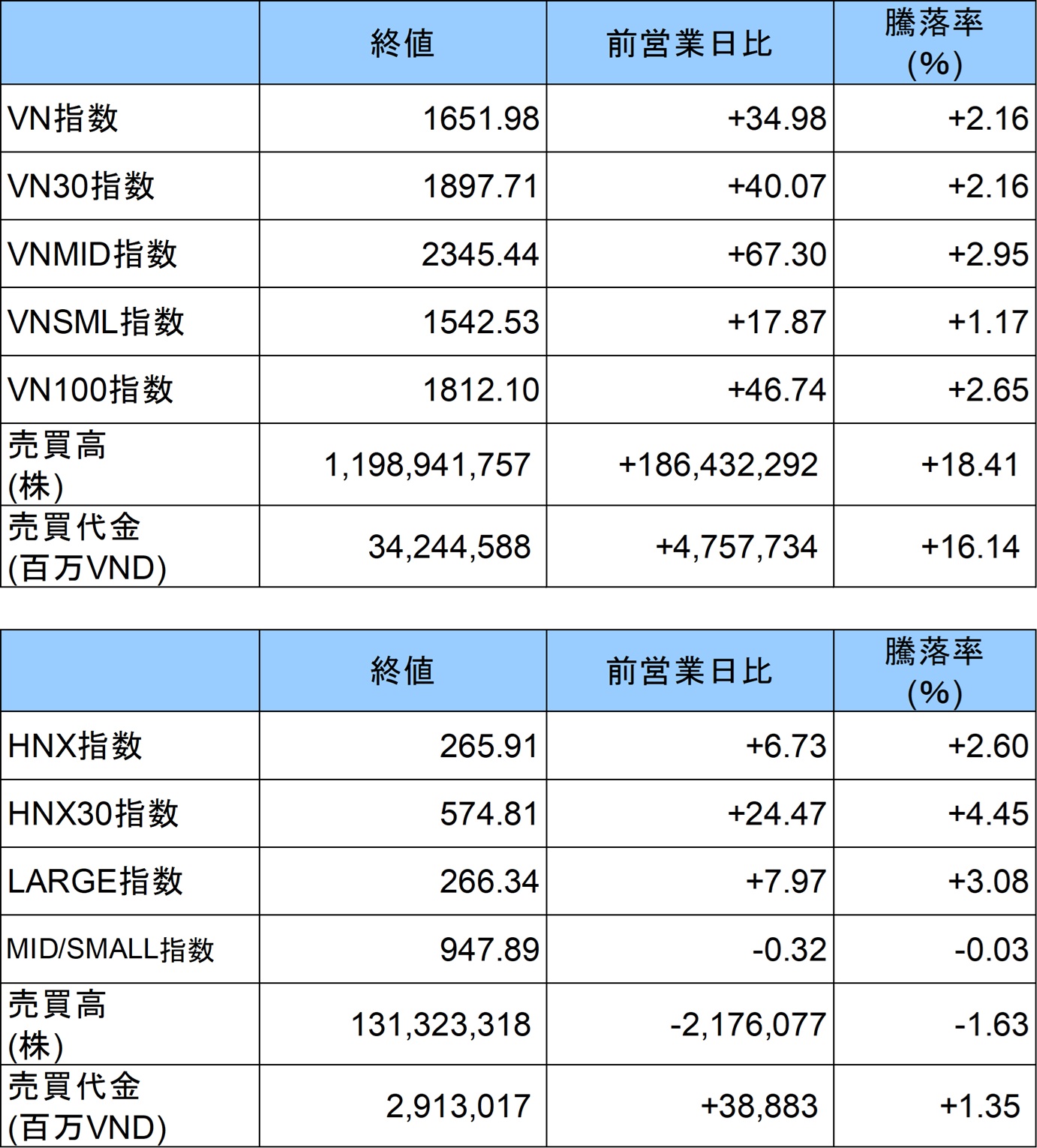 売買代金は34兆2446億VND(約2000億円)、前日比+16.1%増加した。主力株は値上がり銘柄が多く、なかでもVPバンク[VPB]がストップ高で、インデックスをけん引した。
