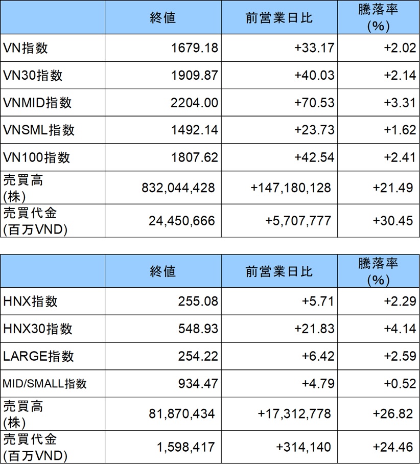 売買代金は1兆5984億VND(約94億円)、前日比+24.5%増加した。主力株は値上がり銘柄が多く、インデックスをけん引した。