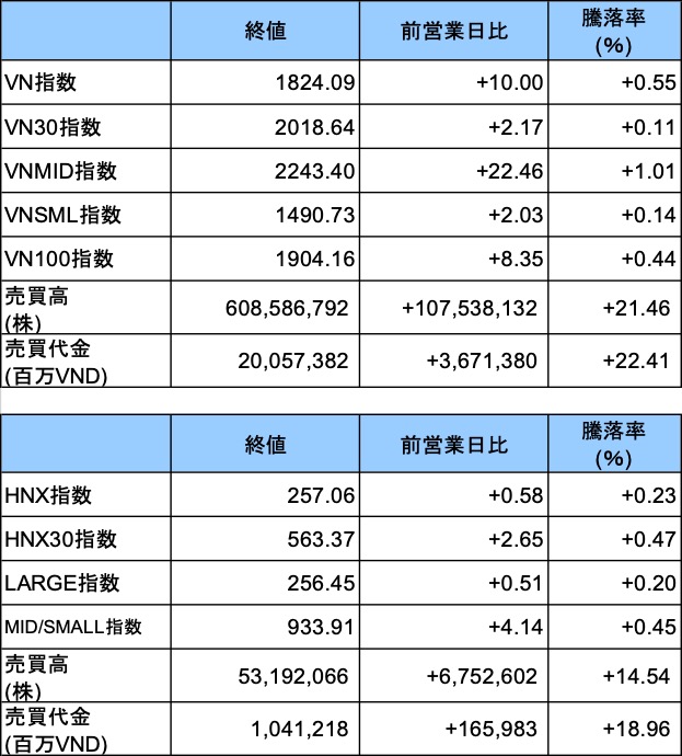 売買代金は20兆0574億VND(約1180億円)、前日比+22.4%増加した。主力株は値上がり銘柄が多く、インデックスをけん引した。