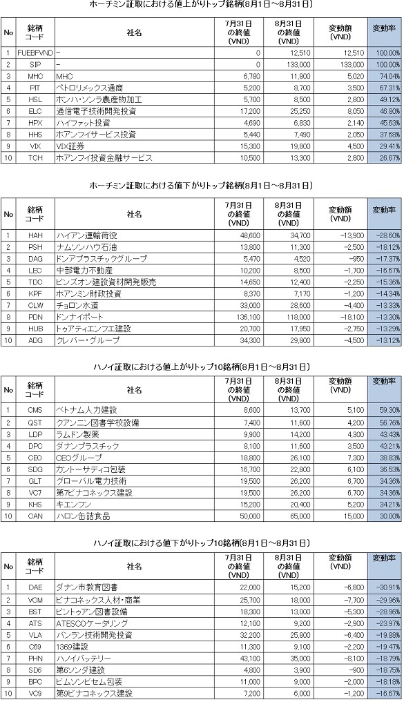 ベトナム株情報 > ベト株ニュース > 市場概況 > 株価変動月間トップ10(8月)