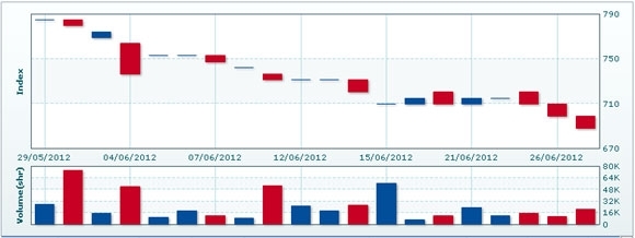 6月28日のCSXインデックスは5.37ポイント(0.78%)下落し、682.8で取引を終えた。売買高は前日比46.2%減の1万1450株、売買代金は同46.6%減の7309万KHRだった。