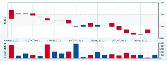 7月4日のCSXインデックスは前日比変わらずの688.17で取引を終えた。売買高は前日比0.35%増の1万1314株、売買代金は同0.35%増の7241万KHRだった。