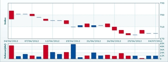 7月5日のCSXインデックスは前日比変わらずの688.17で取引を終えた。売買高は前日比4.5%減の1万0803株、売買代金は同4.5%減の6914万KHRだった。