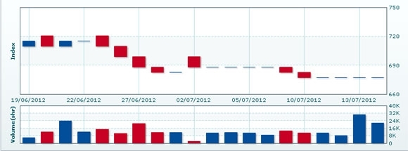7月17日のCSXインデックスは前日比▲5.38ポイント(0.79%)下落し、672.04で取引を終えた。売買高は前日比44.1%増の3万1122株、売買代金は同42.3%増の1億9451万KHRだった。
