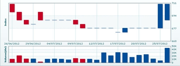 7月27日のCSXインデックスは前日比+21.5ポイント(3.03%)高の731.18で取引を終えた。売買高は前日比+42.2%増の6万3110株、売買代金は同+46.4%増の4億2872万KHRだった。