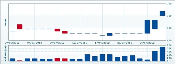 7月30日のCSXインデックスは先週末比▲10.75ポイント(1.47%)安の720.43で取引を終えた。売買高は先週末比▲30.9%減の4万3598株、売買代金は同▲31.7%減の2億9270万KHRだった。
