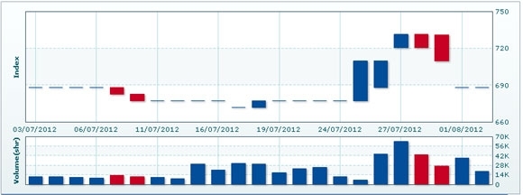 8月3日のCSXインデックスは前日比+10.75ポイント(1.56%)高の698.92で取引を終えた。売買高は前日比▲34.7%減の1万2363株、売買代金は同▲33.7%減の8036万KHRだった。