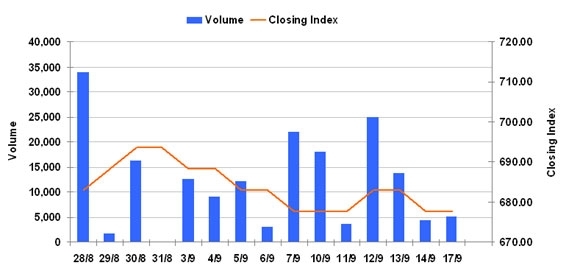 9月17日のCSXインデックスは先週末比変わらずの677.42で取引を終えた。売買高は先週末比+18.9%増の5065株、売買代金は同+18.9%増の3191万KHRだった。