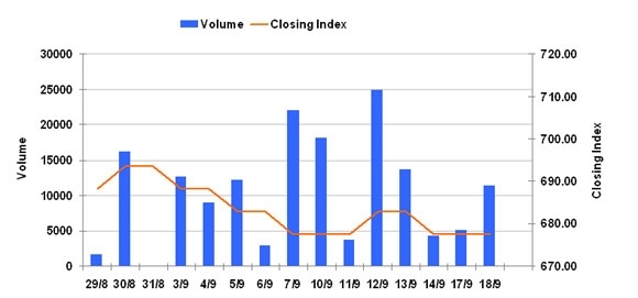 9月18日のCSXインデックスは前日比変わらずの677.42で取引を終えた。売買高は前日比約2.2倍の1万1328株、売買代金は同約2.2倍の7137万KHRだった。
