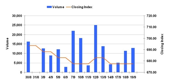 9月19日のCSXインデックスは前日比変わらずの677.42で取引を終えた。売買高は前日比+12.6%増の1万2750株、売買代金は同+12.6%増の8033万KHRだった。