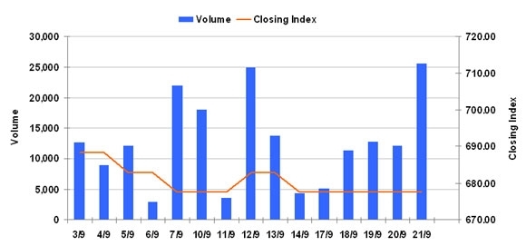 9月21日のCSXインデックスは前日比変わらずの677.42で取引を終えた。売買高は前日比約2.1倍の2万5540株、売買代金は同約2.1倍の1億6090万KHRだった。