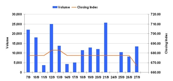 9月27日のCSXインデックスは前日比▲10.75ポイント(1.59%)安の666.67で取引を終えた。売買高は前日比+66.6%増の1万3323株、売買代金は同+64.4%増の8287万KHRだった。