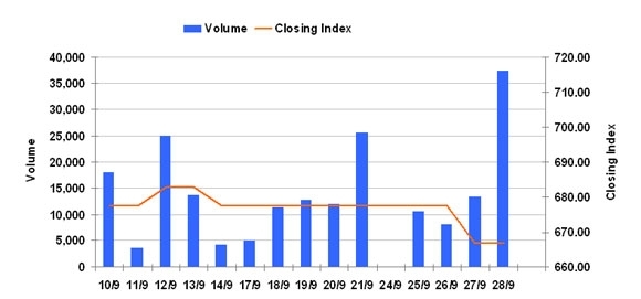 9月28日のCSXインデックスは前日比変わらずの666.67で取引を終えた。売買高は前日比約2.8倍の3万7400株、売買代金は同約2.8倍の2億3188万KHRだった。