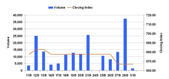 10月1日のCSXインデックスは先週末比変わらずの666.67で取引を終えた。売買高は先週末比▲96.2%減の1438株、売買代金は同▲96.2%減の892万KHRだった。