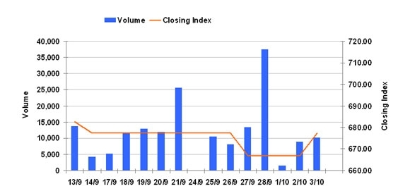 10月3日のCSXインデックスは前日比+10.75ポイント(1.61%)高の677.42で取引を終えた。売買高は前日比+14.5%増の1万0227株、売買代金は同+15.9%増の6419万KHRだった。