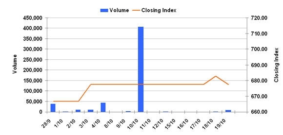 10月19日のCSXインデックスは前日比▲5.38ポイント(0.79%)安の677.42で取引を終えた。売買高は前日比約3.9倍の7758株、売買代金は同約3.8倍の4888万KHRだった。