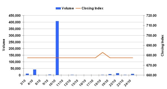 10月24日のCSXインデックスは前日比変わらずの677.42で取引を終えた。売買高は前日比約4.5倍の1万株、売買代金は同約4.5倍の6300万KHRだった。
