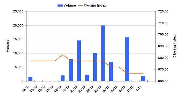 11月1日のCSXインデックスは前日比変わらずの666.67で取引を終えた。売買高は前営業日比▲89.2%減の1680株、売買代金は同▲89.2%減の1042万KHRだった。