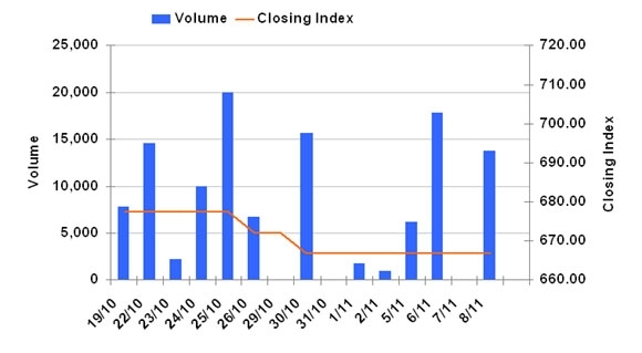 11月8日のCSXインデックスは前営業日比変わらずの666.67で取引を終えた。売買高は前営業日比▲22.9%減の1万3707株、売買代金は同▲22.9%減の8498万KHRだった。