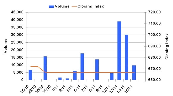 11月15日のCSXインデックスは前日比変わらずの666.67で取引を終えた。売買高は前日比▲67.6%減の9729株、売買代金は同▲67.6%減の6032万KHRだった。